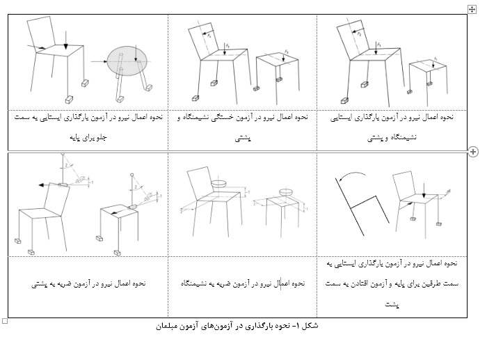 4. آزمایشگاه نانو مواد سلولزی فعالیت های قابل انجام در آزمایشگاه: اندازه گیری پهنای دوایر رویشی، بررسی میکروسکوپی نمونه های جوبی و شناسایی نمونه ها فعالیت های قابل انجام در آزمایشگاه: تهیه خمیر کاغذ شیمیایی و نیمه شیمیایی، ساخت هندشیت آزمایشگاهی، تهیه آرد مواد آلی و معدنی با جارمیل، بخارزنی مواد چوبی، پالایش خمیر و کاغذ و مواد چوبی جهت تهیه MDF، تهیه خمیرکاغذ از کاغذ بازیافتی با پالپر، تهیه دی اکسید کلر خالص جهت رنگبری خمیر کاغذ و اکسیداسیون مواد و تصفیه آب و پساب. 9. آزمایشگاه مهندسی مبلمان به منظور ارزیابی، بررسی و آنالیز مقاومت¬های صندلی، میز و حتی مبلمان صفحه¬ایی ساخته شده از چوب و فلز از دستگاه تست مبلمان بر اساس استانداردهای 12520EN (استاندارد ملی 18688)، 1022EN (استاندارد ملی 9184) و 1728EN (استاندارد ملی 11527) می¬توان استفاده نمود. طبق استاندارد تمامی آزمون¬ها در شرایط محیطی فضاهای سربسته و در دمای23 الی 25 درجه سانتیگراد بایستی صورت پذیرد. همچنین، مبلمان بایستی از 24 ساعت قبل در محیط آزمون قرار گیرد و دوام بارگذاری به مدت حداقل 1±2 ثانیه و فاصله هر بارگذاری ایستایی حداقل 2±10 ثانیه در نظر گرفته شد. همچنین ارزیابی استاندارد به صورت کیفی و مشاهده ظاهری محل اتصالات و دوام و ایستایی سازه مورد نظرصورت پذیرفت. لازم به ذکر است مطابق با استاندارد، از استانداردهای صندلی بدون پشتی برای آنالیز و بررسی مقاومت¬های میز استفاده شده است. ![]() |